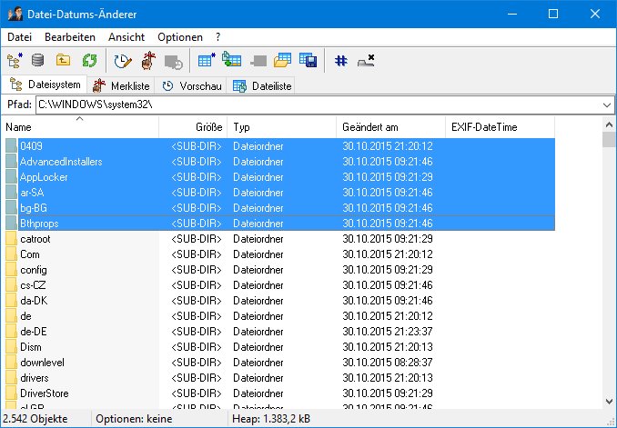 Versionsgeschichtev1.0 (04-Sep-2000): Der Datei-Datums-Änderer erblickt das Licht der Welt. Von jeweils einer Datei lässt sich das Änderungsdatum ändern. Beim Umgang mit schreibgeschützten Dateien treten Probleme auf. Das Info-Fenster ist hellblau. v1.1 (07-Okt-2000): Das Problem mit den schreibgeschützten Dateien wurde behoben. Über einen neuen Menüpunkt bestimmt der Anwender, wie der DDA mit solchen Dateien verfahren soll. Das Info-Fenster ist königsblau und hat eine Scroolbar bekommen. Außerdem besteht nun die Möglichkeit, das Datum von mehreren sich in einem Verzeichnis befindenden Dateien zu "merken" und auf Knopfdruck wieder zurückspeichern. v1.2 (27-Feb-2004): Auf Anregung eines Benutzers ist es nun möglich, mehreren Dateien gleichzeitig ein Datum zuzuweisen. Wahlweise kann der Zeitstempel pro Datei automatisch erhöht werden, so dass z.B. eine Reihe von Dateien aufsteigend nach Alphabet sortiert unterschiedliche Daten zugewiesen bekommt. Weitere Neuigkeit: Die Eingabefelder des DDA enthalten beim Programmstart nun schon das aktuelle Datum sowie die Uhrzeit. v1.3 (22-Okt-2007): Ein weiterer Benutzer äußerte den Wunsch, die Original- Zeitstempel von mehreren Dateien zu erhöhen. Dies kann nun getan werden. Außerdem erfolgt die Eingabe der Zeitstempel-Differenz nun nach Sekunden, Minuten, Stunden, Tagen und Jahren gegliedert. Übergroße Werte (wie z.B. 60 Sekunden) werden automatisch umgerechnet, erstmals sind auch negative Werte erlaubt. v1.4 (14-Mär-2009): Dank der Anregung eines Benutzers lässt sich jetzt ein Verzeichnis komplett mit allen Unterverzeichnissen (rekursiv) bearbeiten. Neue Tastenkürzel ermöglichen einen schnellen Zugriff auf alle Funktionen (die aktivierten Optionen werden direkt im Hauptfenster angezeigt). Einzelne Dateien und Verzeichnisse können auch auf das Programmfenster gezogen und dort fallen gelassen werden, um sie zur Bearbeitung zu öffnen (Drag & Drop). Das Erscheinungsbild wurde an Windows XP angepasst und leicht überarbeitet. Außerdem unterstützt DDA erstmals Eingabeparameter, so dass eine Integration in den Windows Explorer (z.B. über das "Öffnen mit..."-Menü) möglich ist. v1.4.1 (18-Okt-2009): Ein Erhöhen der Zeitstempel war nicht möglich, wenn die Werte für Sekunden, Minuten usw. in der Summe 0 ergaben - dieser Fehler wurde behoben. Hinweis: Diese Version wurde am 29-Sep-2010 ins Download-Archiv von CHIP.de aufgenommen! v1.5 (11-Aug-2013): Viele schon lange geplante, teils durch Benutzer angeregte Änderungen sind in diese Version eingeflossen. Durch die direkte Verwendung von Windows-Betriebssystem-Funktionen können nun endlich alle Dateisystem- Zeitstempel (Erstelldatum, Änderungsdatum, Zugriffsdatum) flexibel angepasst werden, Quelle und Ziel sind hierbei frei wählbar. Eine Unterstützung für EXIF-Zeitstempel in .jpg-Dateien (basierend auf dEXIF 1.03d von Gerry McGuire, vielen Dank!) ermöglicht eine einfache Korrektur des Datums von Digitalfotos oder auch ein Umkopieren zwischen Dateisystem- und EXIF-Zeitstempeln. Neben einer verbesserten Zeit- und Datumseingabe lässt sich jetzt wahlweise auch nur die Uhrzeit oder nur das Datum ändern, außerdem werden ungerade Sekunden verarbeitet. Alle vorgenommenen Einstellungen lassen sich global oder in separaten Dateien speichern, so dass der Benutzer für spezielle Aufgaben eigene Konfigurationsdateien anlegen kann. Das Programm-Icon wurde komplett neu gezeichnet und liegt jetzt in höherer Auflösung vor. Zuguterletzt ist die Benutzeroberfläche nun wahlweise auf deutsch oder englisch anzusehen (basierend auf GNU gettext / dxgettext), und der Quellcode wurde weiter bereinigt sowie dokumentiert (doxygen). v1.6 (01-Feb-2014): Das Extras-Menü hat auf Anregung eines Benutzers eine neue Funktion erhalten, mit der sich das Datum von Verzeichnissen auf die neueste darin enthaltene Datei setzen lässt. Nebenbei wurden im Extras-Menü die erweiterten Einstellungen als solche gekennzeichnet und ein Warnhinweis bei allen Funktionen eingebaut, die mehrere Dateien gleichzeitig verändern. Bei der Funktion "Zeitstempel erhöhen" erleichtert ein Differenz-Taschenrechner unter Angabe von Ist- und Soll-Zeitstempel nun die Anpassung der Zeitstempel von mehreren Dateien, z.B. wenn die Uhr der Digitalkamera falsch gestellt war. Im Optionen-Menü lässt sich der zu verwendende Konvertierungsalgorithmus für Datei-Zeitstempel wählen (ab Windows 7 rechnet der Windows Explorer die Dateizeit anders in lokale Zeit um als bei vorigen Windows-Versionen, um insbesondere Probleme mit der Winter- und Sommerzeitumstellung zu beheben). Statt des deutschen Hilfetextes wurde ggf. der englische angezeigt, wenn "Systemvorgabe" als Sprache ausgewählt war - dies wurde korrigiert. Hinweis: Diese Version wurde am 09-Apr-2015 ins Download-Archiv von CHIP.de und am 10-Mär-2016 ins Download-Archiv von GIGA.de aufgenommen! v1.7 (14-Aug-2016): Bei der Verarbeitung mehrerer Dateien friert DDA nun nicht mehr ein, sondern zeigt eine interaktive Fortschrittsanzeige. Neben der aktuell verarbeiteten Datei wird darin die Anzahl der bereits erledigten Dateien (und Verzeichnisse) sowie der aktuelle Speicherverbrauch angezeigt. Außerdem lassen sich länger andauernde Aktionen bei Bedarf einfach abbrechen. Darüberhinaus ermöglicht eine Rückgängig-Funktion das Zurücksetzen der geänderten Daten auf den Stand vor der letzten Bearbeitung. Auf Wunsch eines Benutzers ist es jetzt möglich, das Datum von Verzeichnissen alternativ zur neuesten auch auf die älteste darin enthaltene Datei zu setzen - so lässt sich z.B. das Erstelldatum von Verzeichnissen nach einem Kopiervorgang rekonstruieren. Ein weiterer Benutzer hat eine Export- und Import-Funktion für Dateidaten (als CSV-Datei) angeregt, um Daten einfach mit externen Programmen weiterverarbeiten zu können. Neben den genannten neuen Funktionen gab es aber auch Fehlerbereinigungen: Die rekursiven Funktionen berücksichtigen inzwischen auch versteckte Dateien sowie 
